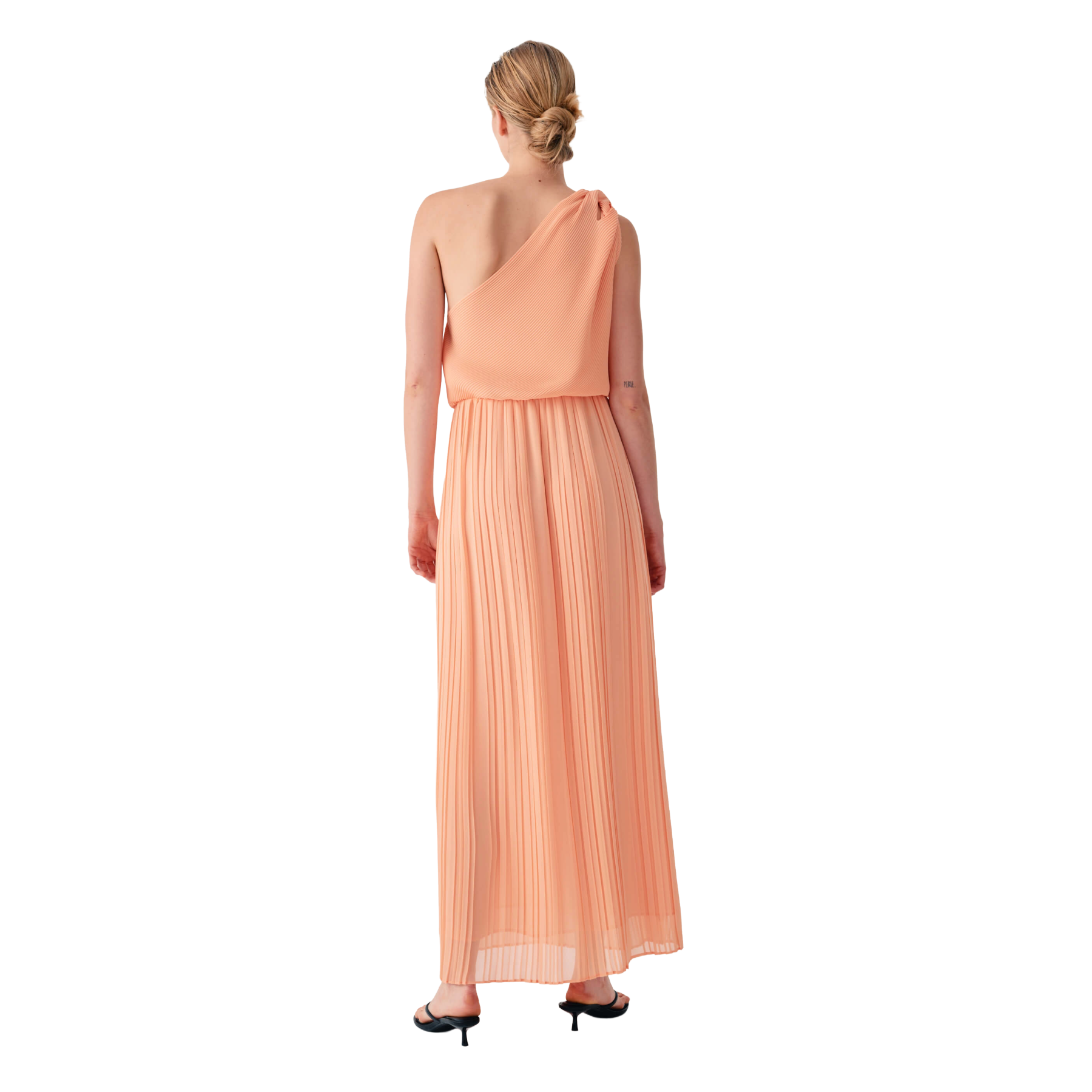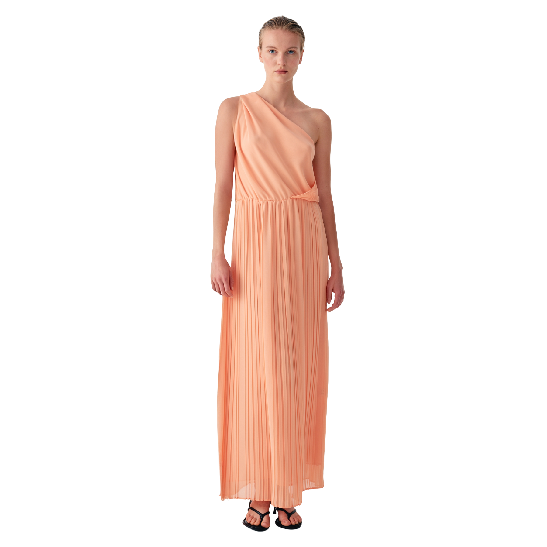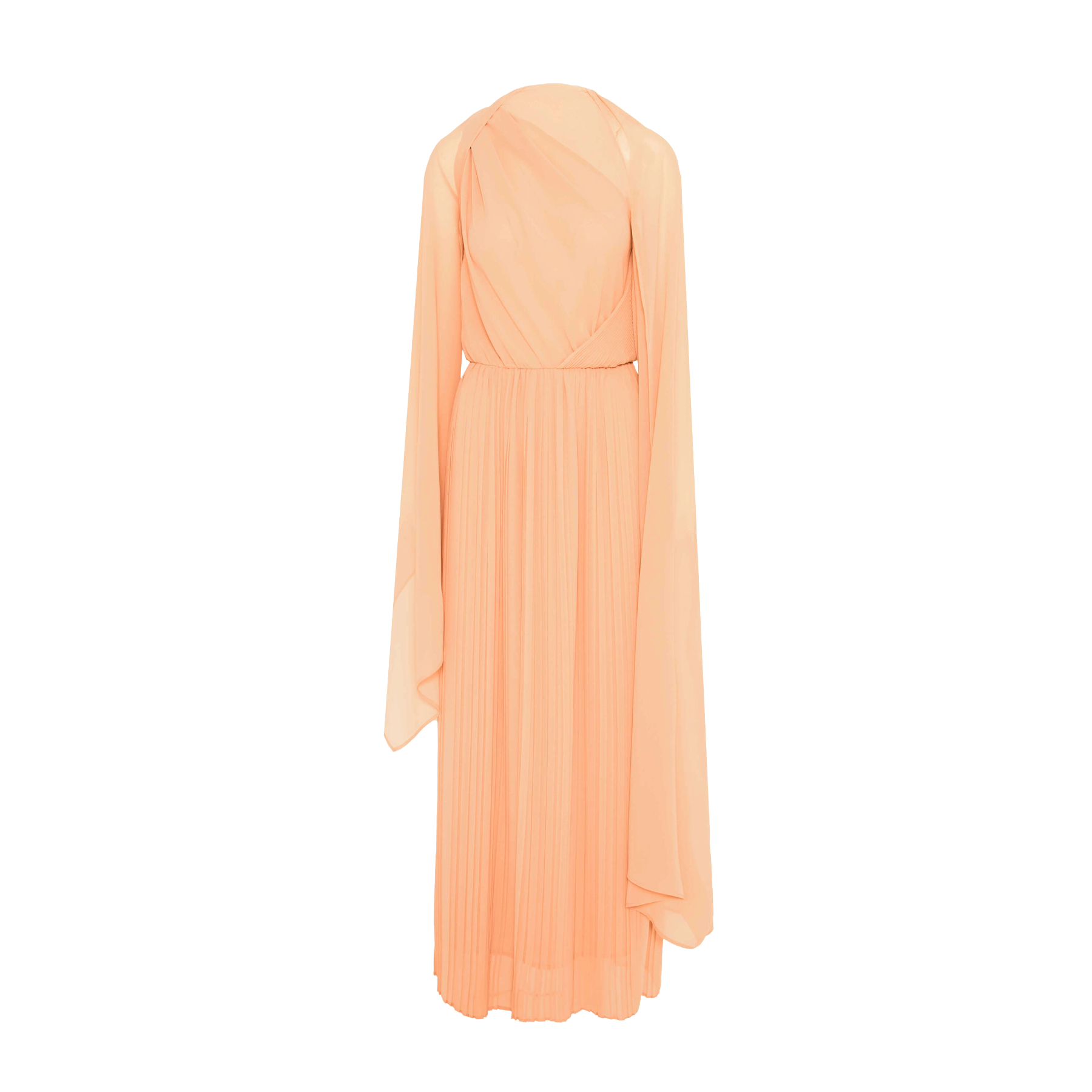 Chiffon midi dress with a draped bodice and wide, flowing sleeves. The light texture and graceful pleats lend the piece an ethereal, timeless elegance. Made in Italy.