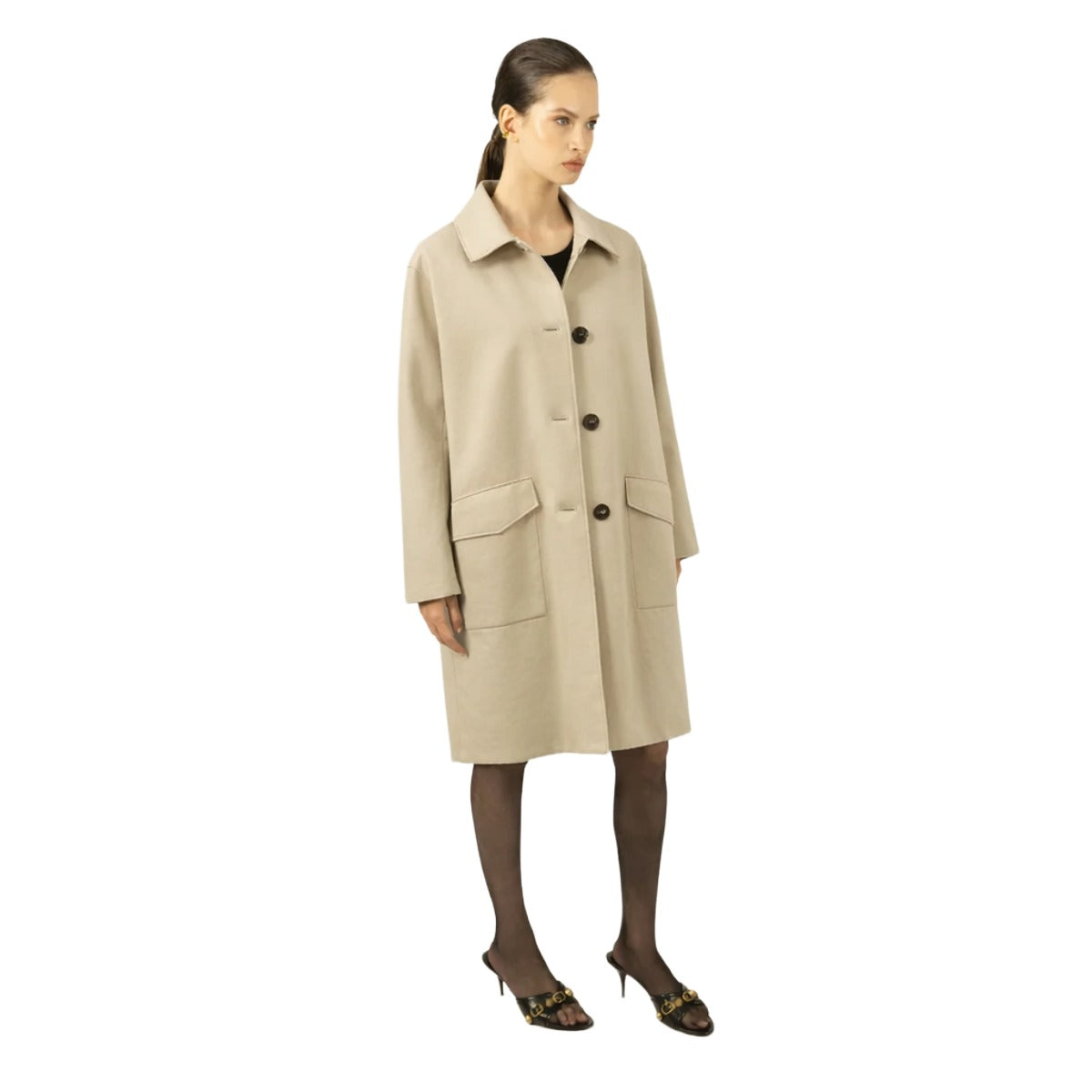 The clean lines of this model are designed to enhance the female figure: the silhouette is slightly flared at the bottom, a strategic cut that skims the hips without clinging, giving a fluid and elegant movement to your walk. The sartorial rigor of the single-breasted, 4-button design is embellished by the use of natural bone, a classy material detail that creates a refined contrast.