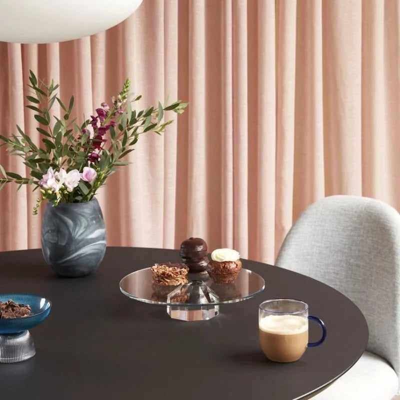 These clear glasses come in a set of four, with handles in amber, blue, pink, and white. The colored handles give the cups an elegant, minimalist look. This product is handmade and may vary slightly.
